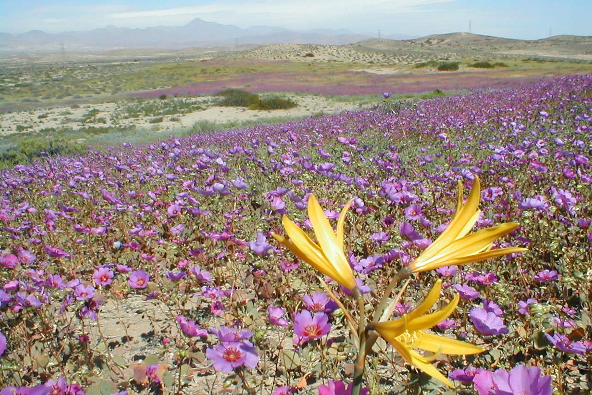 Di belahan dunia lain, gurun Atacama di Chili—yang merupakan salah satu tempat paling kering di bumi—kadang mengalami fenomena serupa. Gurun yang biasanya tampak tak bernyawa mendadak dipenuhi bunga ungu dan merah muda setelah hujan turun, menciptakan pemandangan yang hampir seperti lukisan surealis.